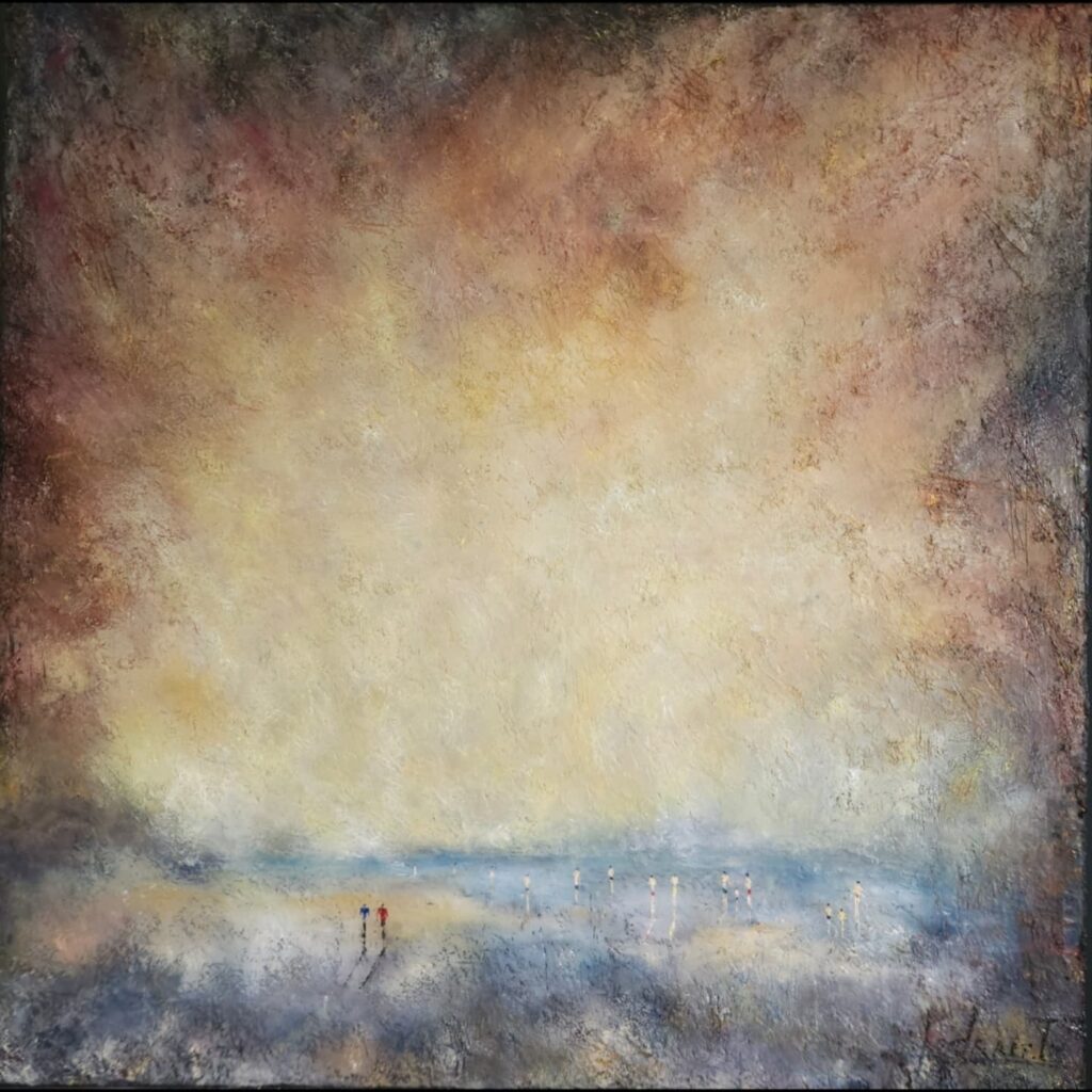 Son travail repose exclusivement sur l’huile, une matière noble qu’il applique en couches successives, lentes et réfléchies. Chaque strate est une étape dans la construction du tableau, par endroits, la surface est grattée au couteau, comme si le peintre cherchait à révéler une vérité enfouie sous la peau de la toile. Cette technique, qui conjugue patience et spontanéité, donne naissance à des textures riches, à des vibrations profondes, où la lumière semble filtrer de l’intérieur.